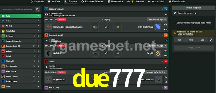 A aposta due777 oferece aos jogadores a experiência mais conveniente de apostas em eSports!
